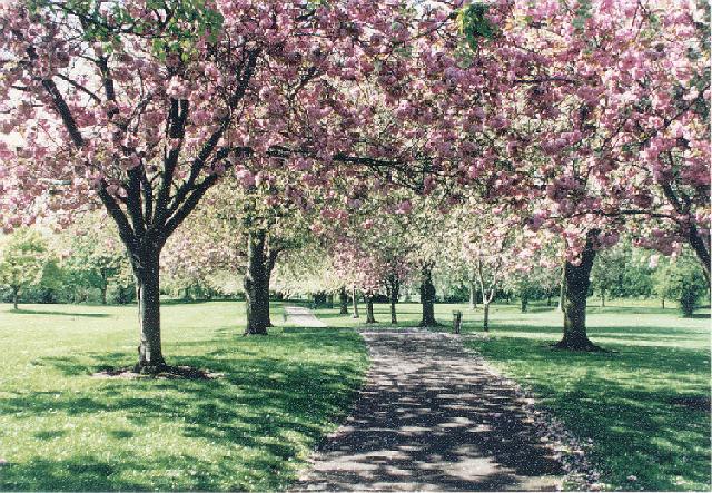 The Wellhead Gardens are a delight in springtime when the cherry blossom is in bloom. White and pink flowering cherry trees that line the main path form a colourful avenue for lunchtime strollers and many visitors walk the path and then, enchanted by the sight, retrace their steps to take another look. |